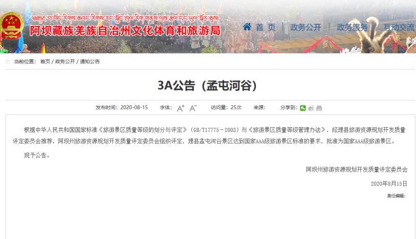 2020年8月,孟屯河谷景區(qū)多措并舉成功創(chuàng)建為國家AAA級旅游景區(qū),為理縣全域旅游建設(shè)新增了一張?zhí)厣?/span>