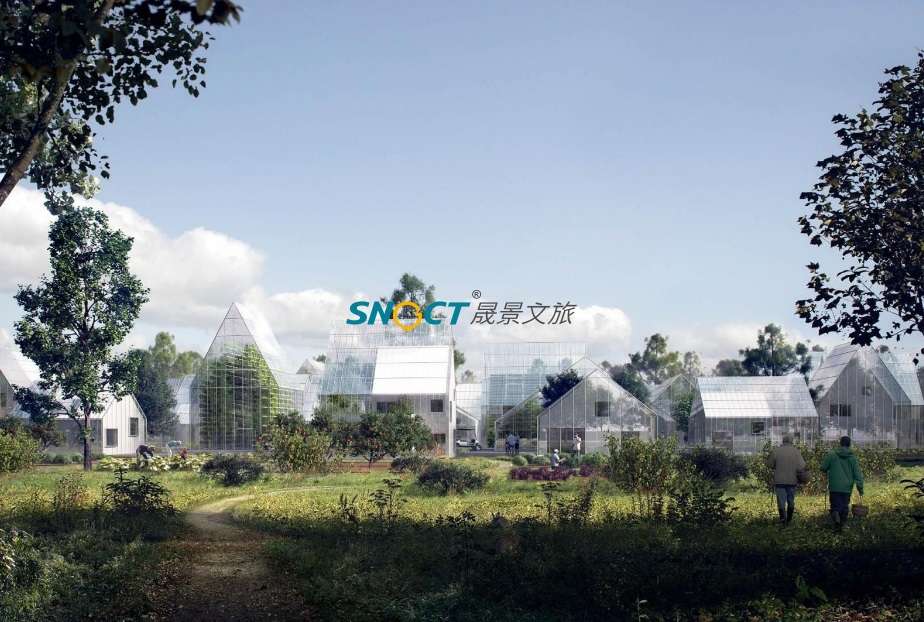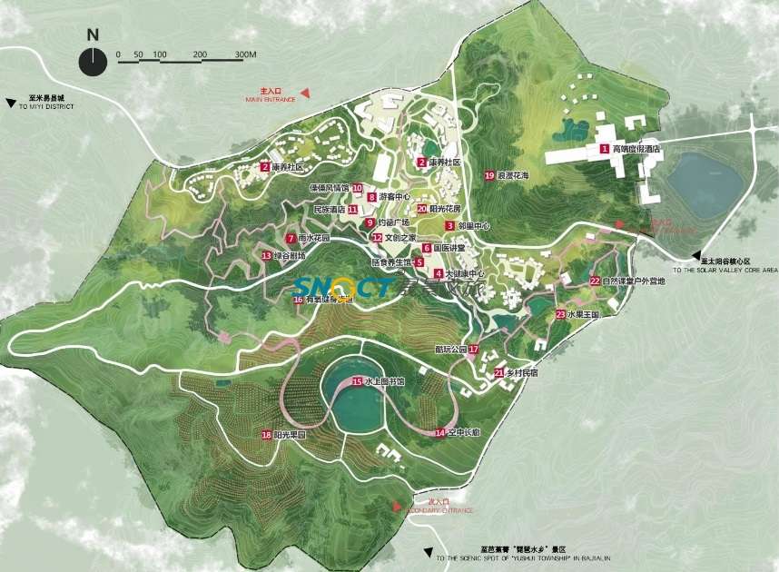 復(fù)雜的河谷沖溝地形與嚴(yán)苛的干熱河谷氣候是本項(xiàng)目最大的設(shè)計(jì)挑戰(zhàn),規(guī)劃通過日照光環(huán)境、氣溫、降雨、風(fēng)環(huán)境等條件,進(jìn)行合理化的規(guī)劃布局、制定建筑設(shè)計(jì)策略以及創(chuàng)新引入雨洪管理系統(tǒng),解決當(dāng)?shù)囟燃倏叼B(yǎng)、娛樂休閑等業(yè)態(tài)所必須的居住環(huán)境、景觀環(huán)景與生態(tài)環(huán)境所面臨的一些列挑戰(zhàn)。同時(shí)抓住當(dāng)?shù)貧v史文脈與地域資源,以“核心綠谷”為規(guī)劃理念,形成了以“水果之都、康養(yǎng)之城、太陽之源”為特色優(yōu)勢,以“西極昧谷,太陽之源,顓頊故里,傈僳之鄉(xiāng)”為文化主題的特色康養(yǎng)度假田園綜合體。